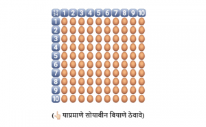 नंतर वर दिलेल्या पद्धतीप्रमाणे प्रत्येक ओळीमध्ये 10-10 बियांचा वापर करून 10-10 च्या रांगा करून व्यवस्थितपणे बियाणे ठेवून घ्यावे. (वर सुरवातीला दिलेल्या आकृती प्रमाणे करावे)