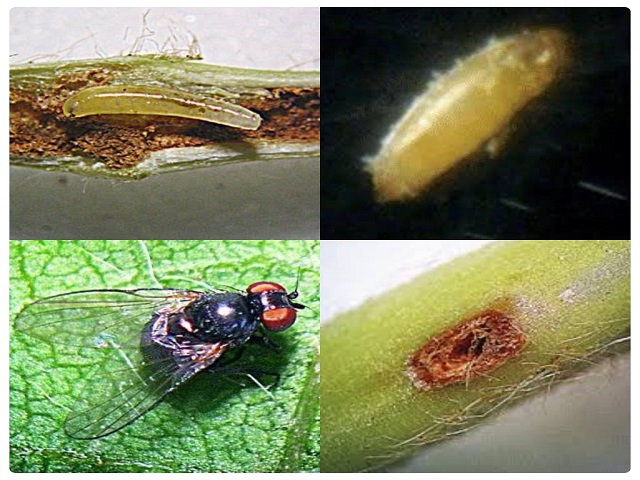 • किडीची ओळख :प्रौढ माशी आकाराने फक्त २ मि.मी. व चमकदार काळ्या रंगाची असते. प्रौढ माशी दलपत्र किंवा पानाच्या आतमध्ये अंडी घालते. अंड्यामधून बाहेर पडणारी या किडीची छोटी अळी पिकाला नुकसानकारक असते. पूर्ण विकसित अवस्थेत ही अळी हलक्या पिवळ्या रंगाची व साधारणतः ३ ते ४ मि.मी. लांबीची असते.