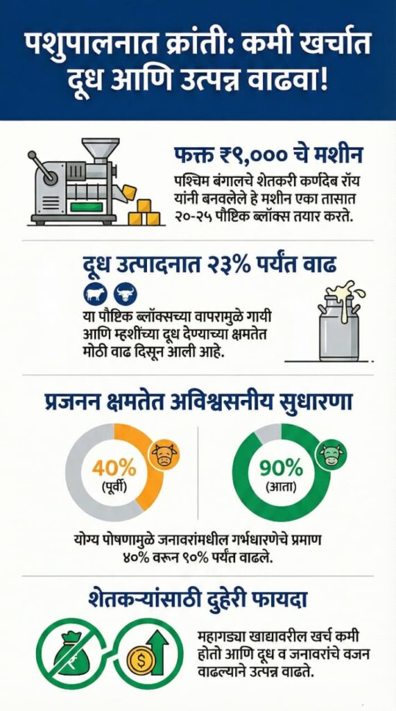 या मशीनच्या यशामागील विज्ञान समजून घेणे आवश्यक आहे. यूरिया मिनरल मोलासेस ब्लॉक्स (UMMB) ही संकल्पना नवीन नाही. FAO आणि NDDB सारख्या संस्थांनी अनेक दशकांपासून या तंत्रज्ञानाला प्रोत्साहन दिले आहे. परंतु, त्याच्या उत्पादनाची प्रक्रिया क्लिष्ट आणि महाग असल्याने ती सर्वसामान्य शेतकऱ्यांपर्यंत पोहोचू शकली नाही. कर्णदेब रॉय यांच्या मशीनने नेमका हाच अडथळा दूर केला. त्यांनी या प्रस्थापित विज्ञानाला शेतकऱ्याच्या घरात पोहोचवणारा “missing link” म्हणजेच एक स्वस्त आणि सोपे विकेंद्रित उत्पादन साधन उपलब्ध करून दिले. UMMB हे एक कमी खर्चाचे पूरक खाद्य आहे, जे गहू आणि तांदळाच्या पेंढ्यासारख्या कमी पौष्टिक चाऱ्याची गुणवत्ता वाढवते.