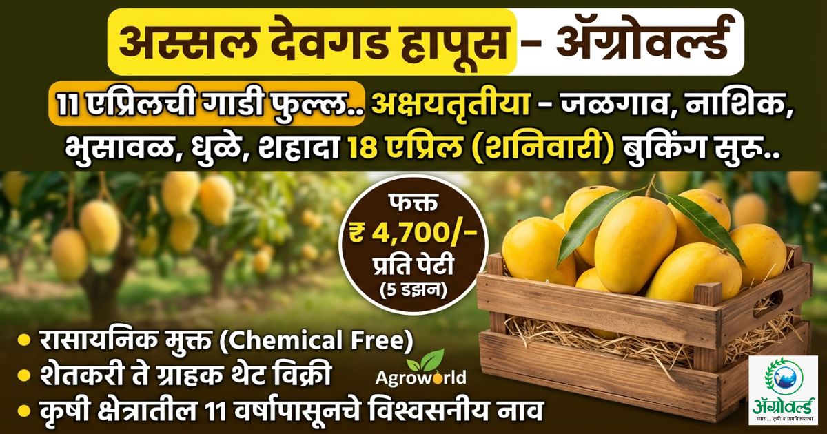 अस्सल देवगड हापूस – ॲग्रोवर्ल्ड.. 11 एप्रिलची गाडी फुल्ल.. अक्षयतृतीया – जळगाव, नाशिक, भुसावळ, धुळे, शहादा 18 एप्रिल (शनिवारी) बुकिंग सुरू..