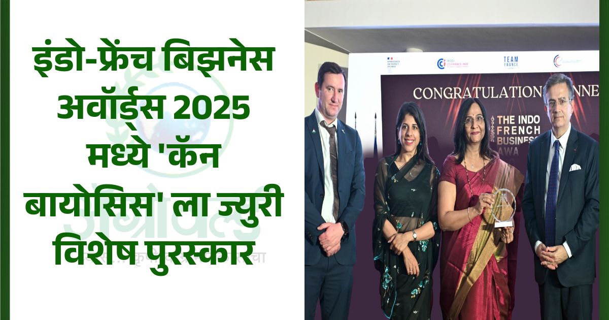 नवी दिल्ली (प्रतिनिधी) जैविक शेती निविष्ठा उत्पादन क्षेत्रात कार्यरत असलेल्या ‘कॅन बायोसिस’ या बहुराष्ट्रीय कंपनीला इंडो फ्रेंच चेंबर ऑफ कॉमर्स अँड इंडस्ट्रीज (IFCCI) तर्फे दिल्या जाणाऱ्या प्रतिष्ठेच्या इंडो-फ्रेंच बिझनेस अवॉर्ड्स 2025 मध्ये “ज्युरी स्पेशल अवॉर्ड” ने सन्मानित करण्यात आले. दिल्लीतील फ्रेंच दूतावासात नुकत्याच पार पडलेल्या पुरस्कार सोहळ्यात, कंपनीच्या संस्थापक आणि व्यवस्थापकीय संचालिका संदीपा कानिटकर यांनी हा पुरस्कार फ्रान्सचे भारतातील राजदूत थियरी मॅथ्यू यांच्या हस्ते स्वीकारला.