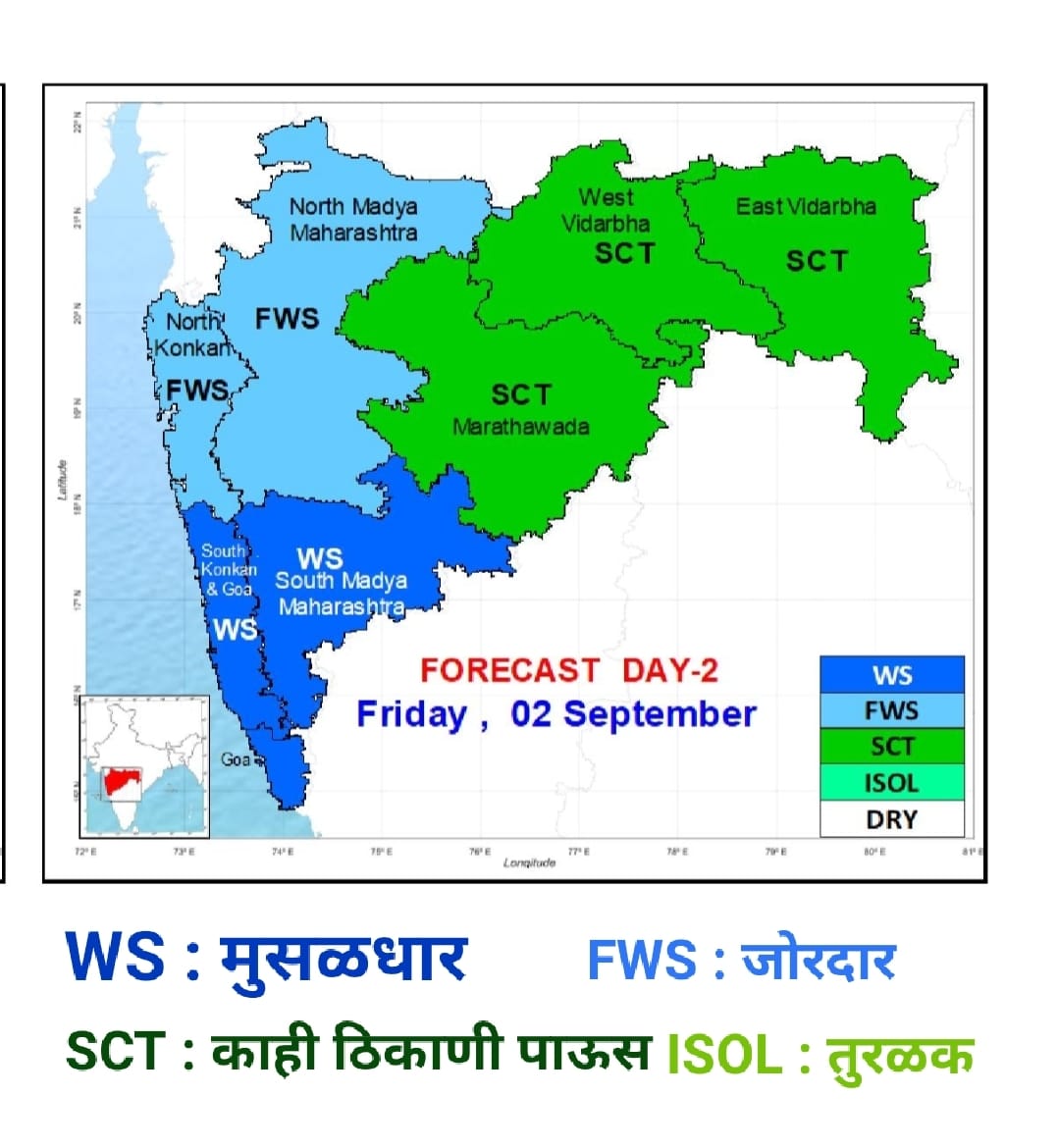 सप्टेंबरमध्ये शेवटच्या टप्प्यात राज्याच्या बहुतांश भागात सरासरीपेक्षा अधिक पाऊस होईल, असा हवामान खात्याचा अंदाज आहे. या कालावधीत संपूर्ण देशभरात सरासरीच्या तुलनेत 109 टक्के अधिक पाऊस होण्याची शक्यता आहे. मुंबई, ठाण्यासह संपूर्ण कोकण विभाग, पश्चिम महाराष्ट्र, दक्षिण मराठवाडा आणि पूर्व विदर्भात शेवटच्या टप्प्यामध्ये काही भागांत मुसळधारांची शक्यता आहे. मुंबई, ठाणे, पालघर, रायगड, रत्नागिरी, सिंधुदुर्ग, सातारा, सांगली, पुणे, सोलापूर, नाशिक, बीड, लातूर, उस्मानाबाद, नांदेड, परभणी, गडचिरोली, चंद्रपूर, अमरावती, वर्धा आदी जिल्ह्यांत या महिन्यात अधिक पाऊस होण्याचा अंदाज आहे.