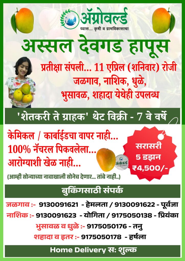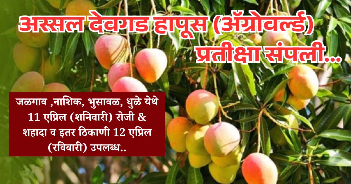 अस्सल देवगड हापूस (ॲग्रोवर्ल्ड) प्रतीक्षा संपली… जळगाव ,नाशिक, भुसावळ, धुळे येथे 11 एप्रिल (शनिवारी) रोजी & शहादा व इतर ठिकाणी 12 एप्रिल (रविवारी) उपलब्ध… (फक्त 90 पेटी उपलब्ध)