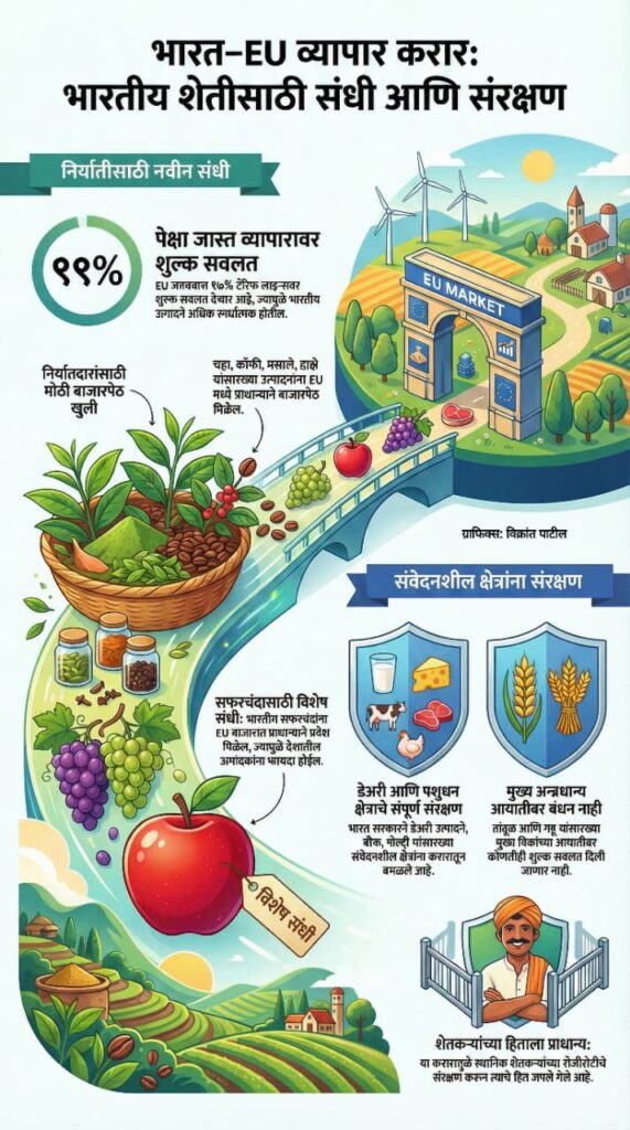 प्राधान्य बाजारपेठ प्रवेश (Preferential Market Access): चहा, कॉफी, मसाले, द्राक्षे, घेवड्याच्या शेंगा, काकडी आणि सुका कांदा यांसारख्या भारतीय कृषी उत्पादनांना युरोपियन युनियनच्या बाजारपेठेत प्राधान्याने प्रवेश मिळेल.