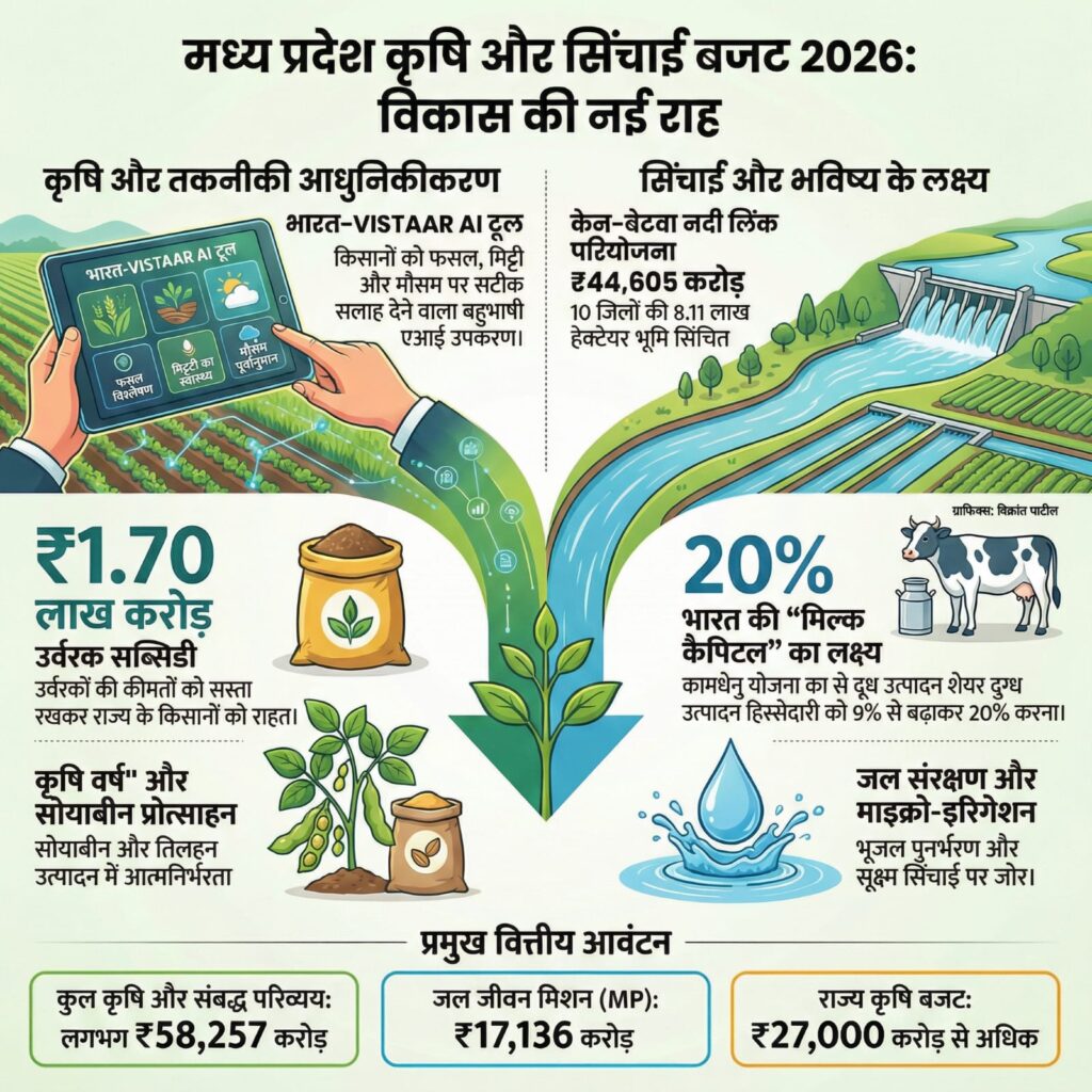 मध्य प्रदेश के कृषि और संबद्ध क्षेत्रों के लिए कुल परिव्यय (Combined Outlay) लगभग ₹58,257 करोड़ तक पहुंच गया है। यह राशि केंद्र और राज्य की साझा शक्ति को दर्शाती है। जहाँ केंद्रीय बजट ने इस ‘कृषि वर्ष’ के लिए वित्तीय आधार और तकनीकी ढांचा तैयार किया है, वहीं फरवरी के मध्य में शुरू होने वाला मध्य प्रदेश का राज्य बजट सत्र इन योजनाओं के वास्तविक कार्यान्वयन और जिला-वार वितरण की अंतिम रूपरेखा पेश करेगा।