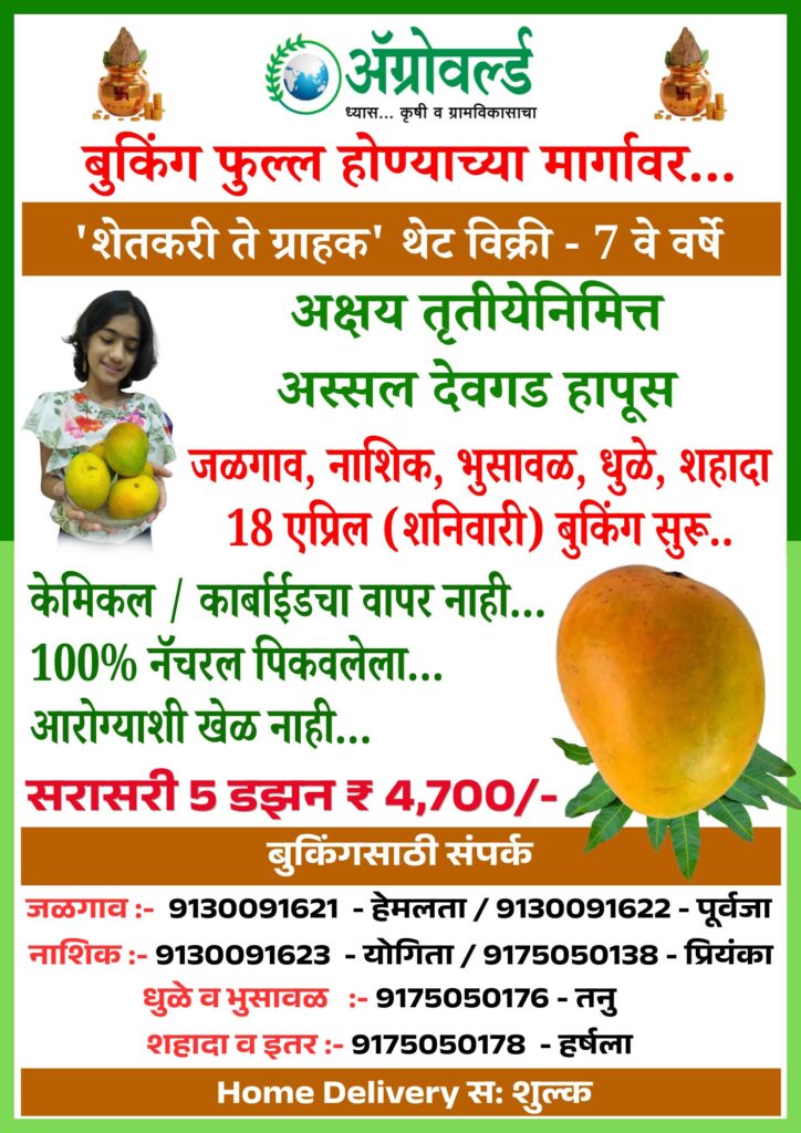 अस्सल देवगड हापूस – ॲग्रोवर्ल्ड.. 11 एप्रिलची गाडी फुल्ल.. अक्षयतृतीया – जळगाव, नाशिक, भुसावळ, धुळे, शहादा 18 एप्रिल (शनिवारी) बुकिंग सुरू..