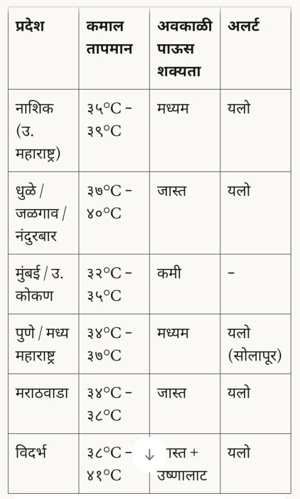 उत्तर महाराष्ट्रातील नाशिक, धुळे, नंदुरबार आणि जळगाव या जिल्ह्यांमध्ये कमाल तापमान 37°C ते 40°C च्या दरम्यान राहण्याचा अंदाज असून हवामान उष्ण व शुष्क राहणार आहे. तथापि, काही भागात तुरळक विजांच्या कडकडाटासह हलका पाऊस होण्याची शक्यता नाकारता येत नाही.